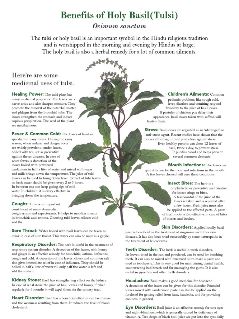 Taking Tulsi everyday as tea or otherwise increases immunity and help the drinker prevent diseases stabilize his or her health condition balance his or her body system and most important of all prolong his or her life. 06032018 The Tulsi leaf has a great medicinal value and is used to cure various ailments and the most familiar amongst all is common cold. The leaves strengthen the stomach and help in respiratory diseases.